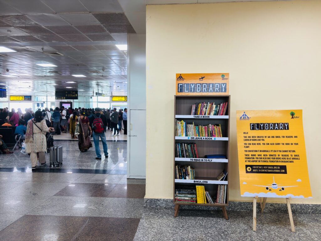 The FLYBRARY is a small open library at Bhubaneswar Airport. There are 2 shelves, one each at DEPARTURE and at ARRIVAL. You can pick up a book of your choice, read it and return it to the shelf there. Or you can take the book with yourself, read and return by post.